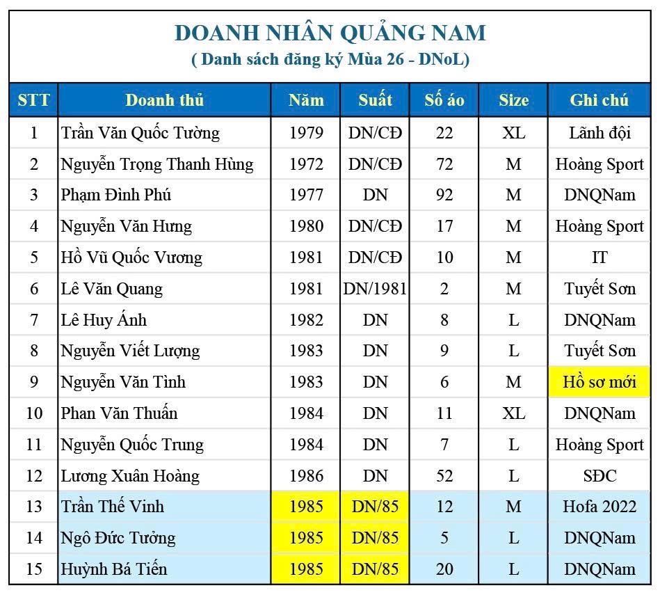 BTC duyệt các thành viên sau đây tham gia đội DN Quảng Nam mùa 26: