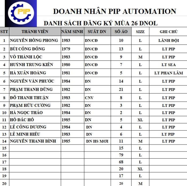 BTC duyệt các thành viên sau đây tham gia đội PIP AUTOMATION mùa 26:
