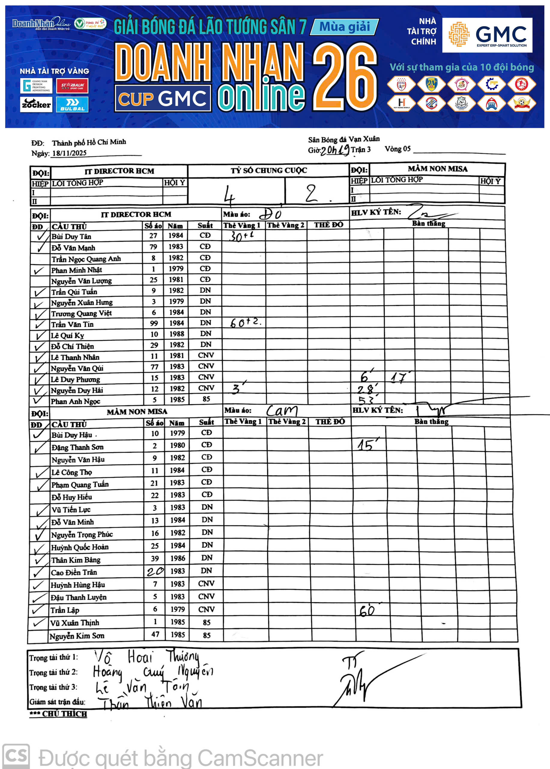 Kết quả Vòng 4 Giải Sân 7 Lão tướng DNOL Cup GMC Mùa 26 năm 2025-2026 Kết quả Vòng 4 Giải Sân 7 Lão tướng DNOL Cup GMC Mùa 26 năm 2025-2026 (13/11/2025, 09:52 AM)