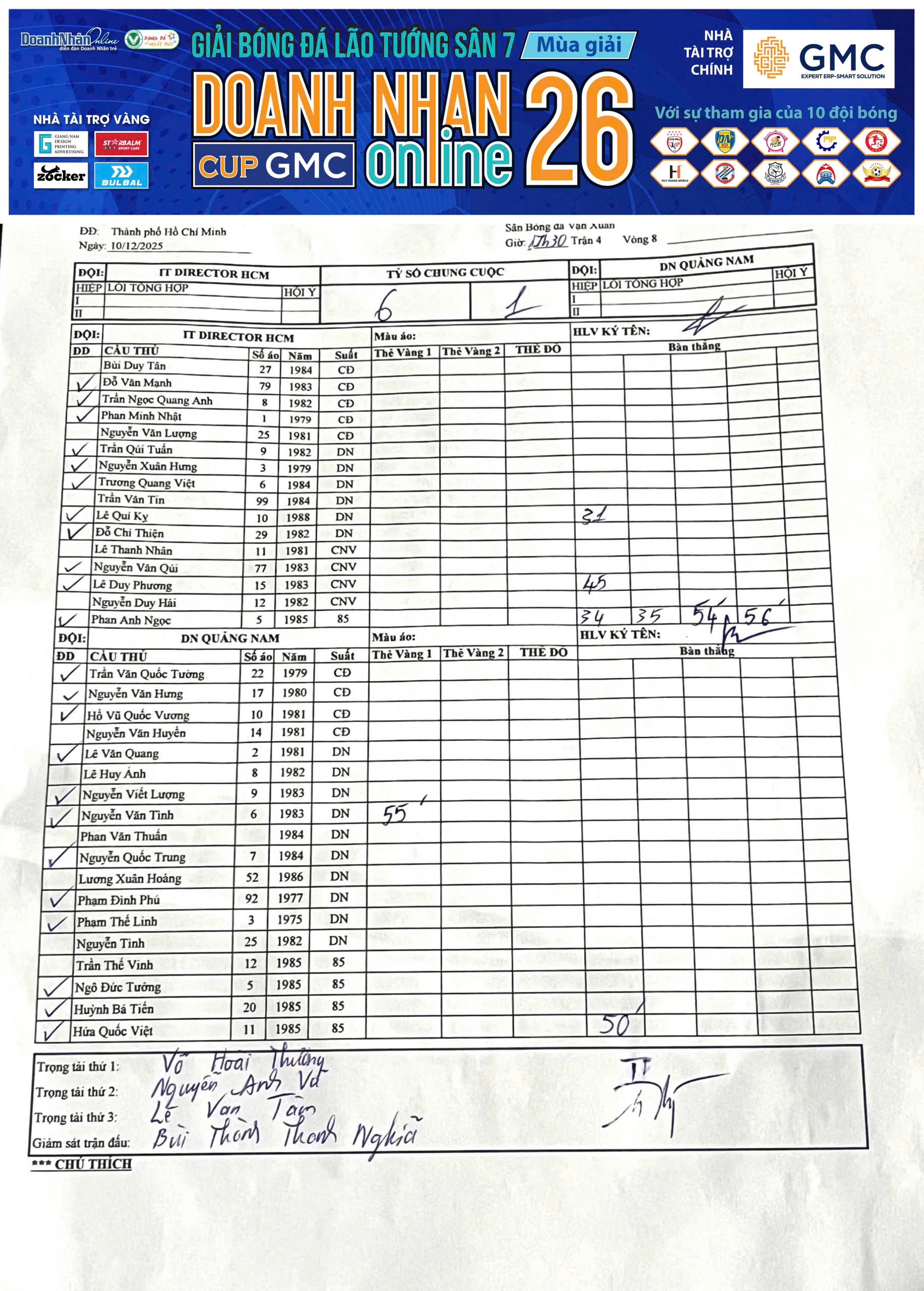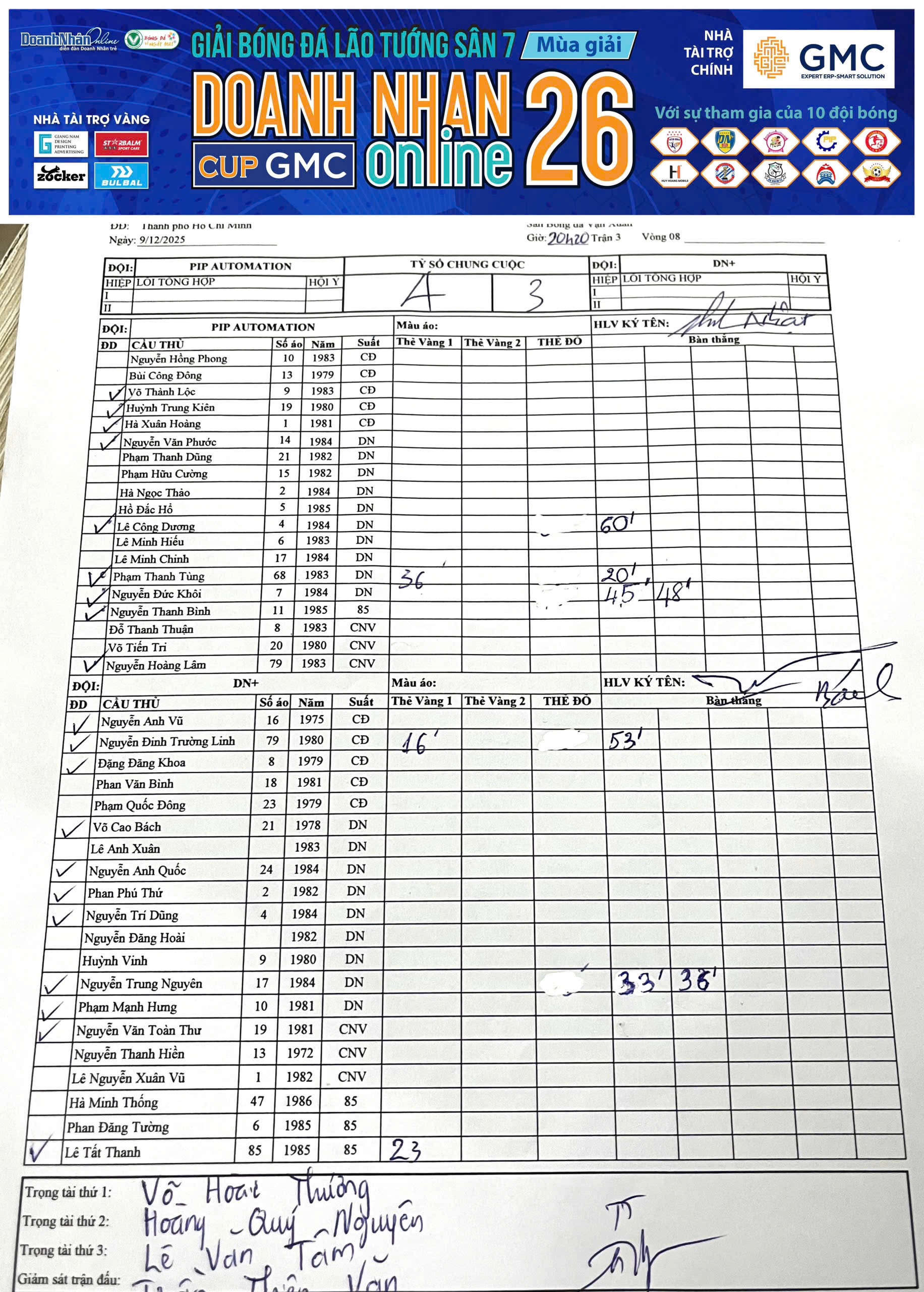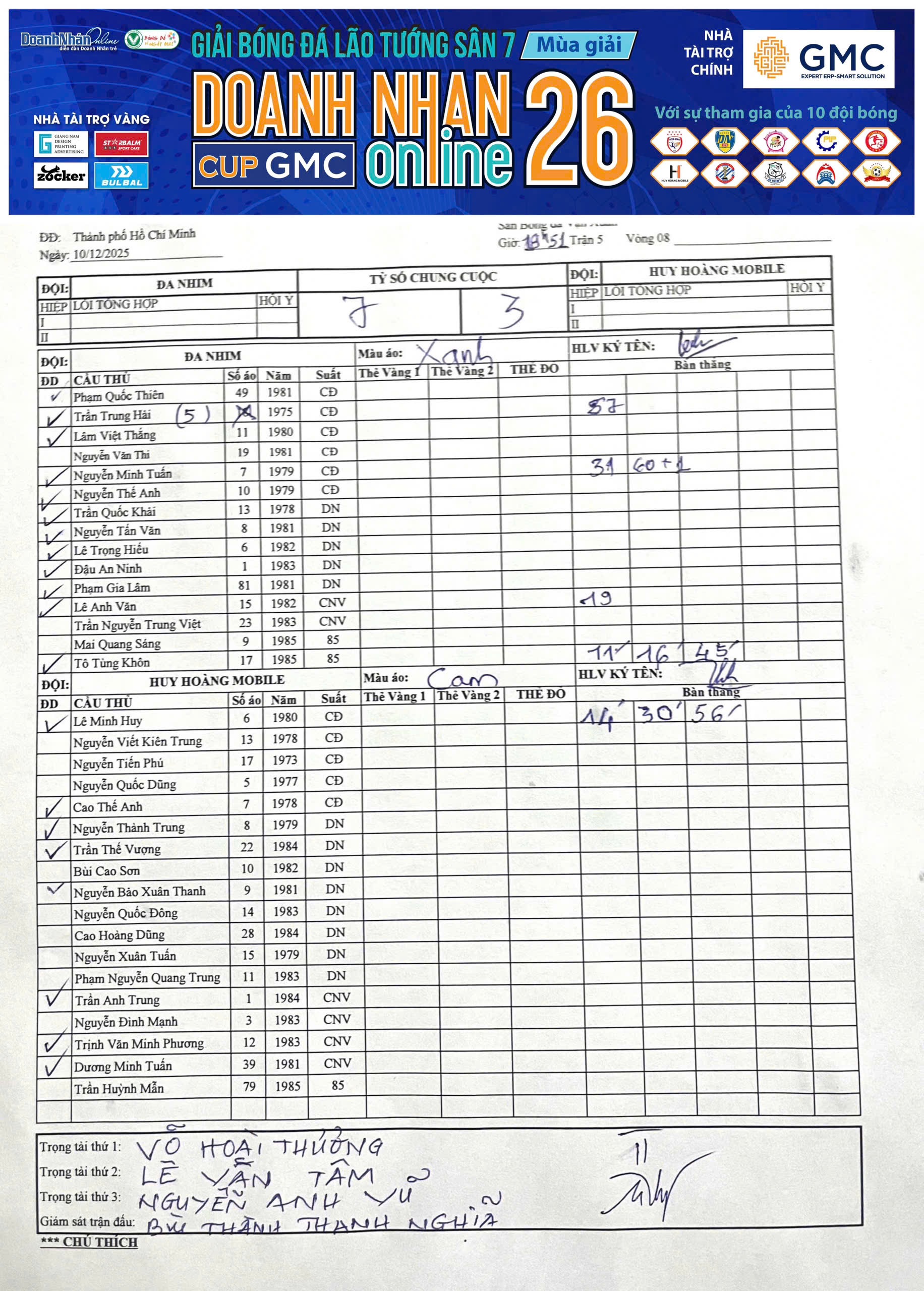 Kết quả Vòng 3 Giải Sân 7 Lão tướng DNOL Cup GMC Mùa 26 năm 2025-2026 (06/11/2025, 08:16 AM)