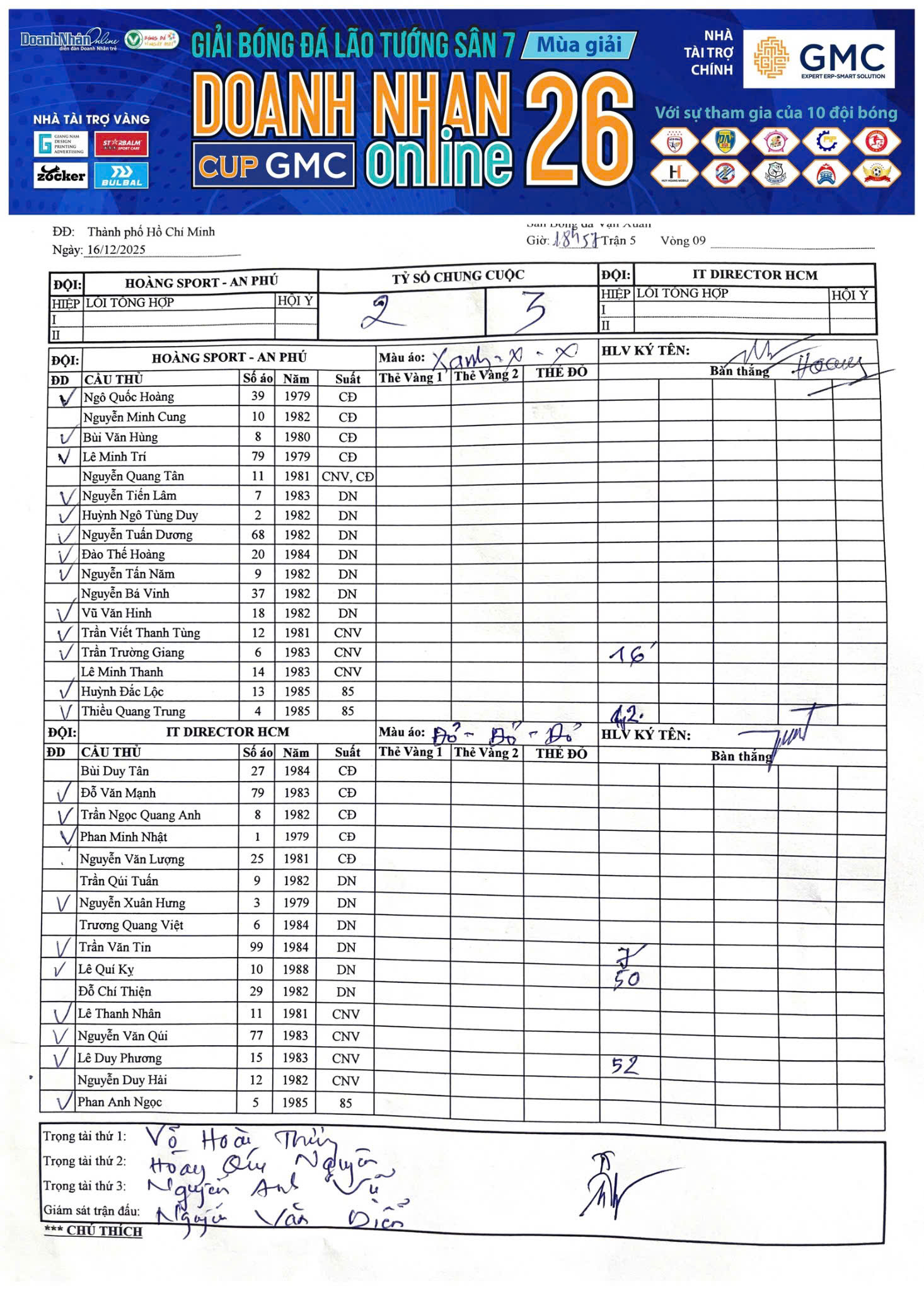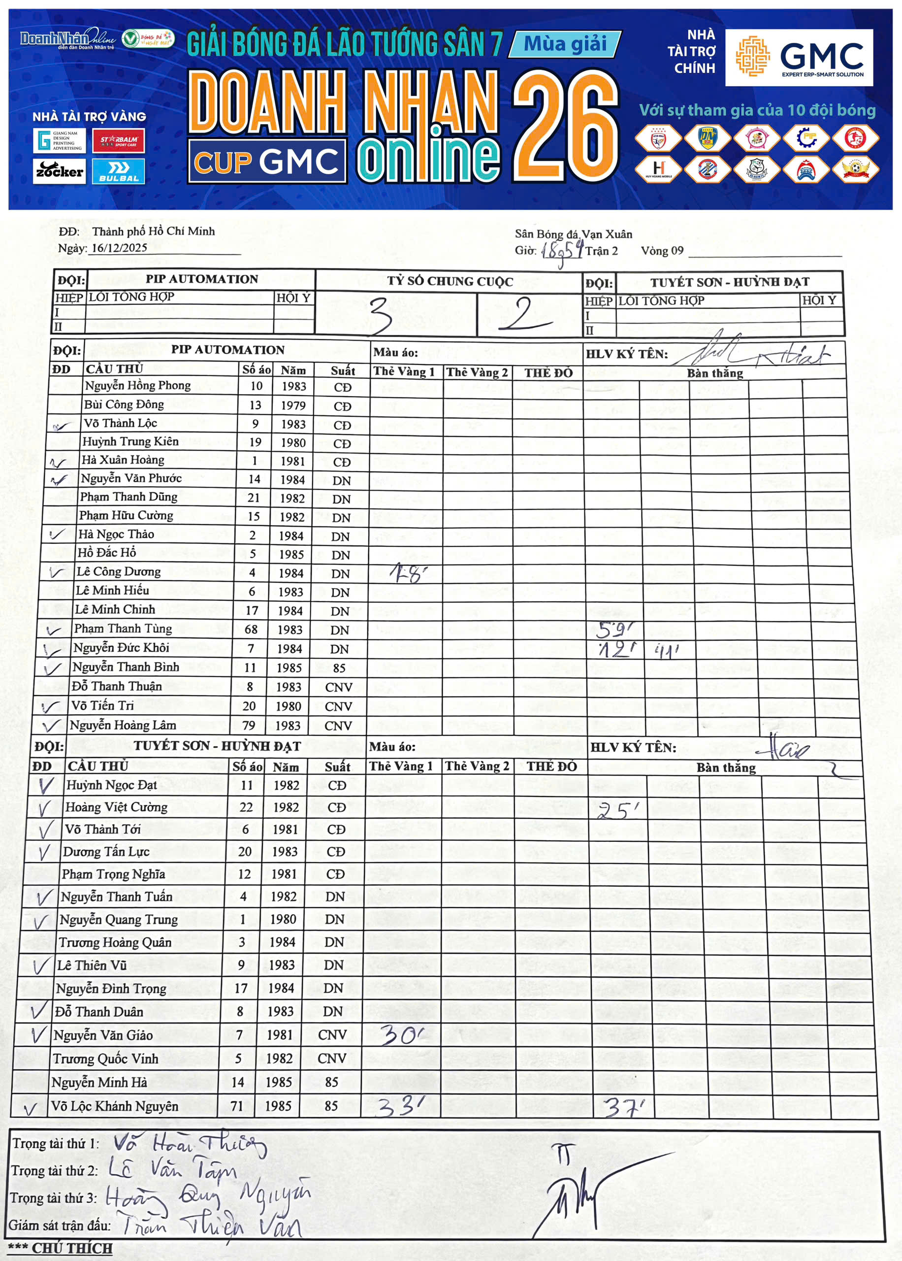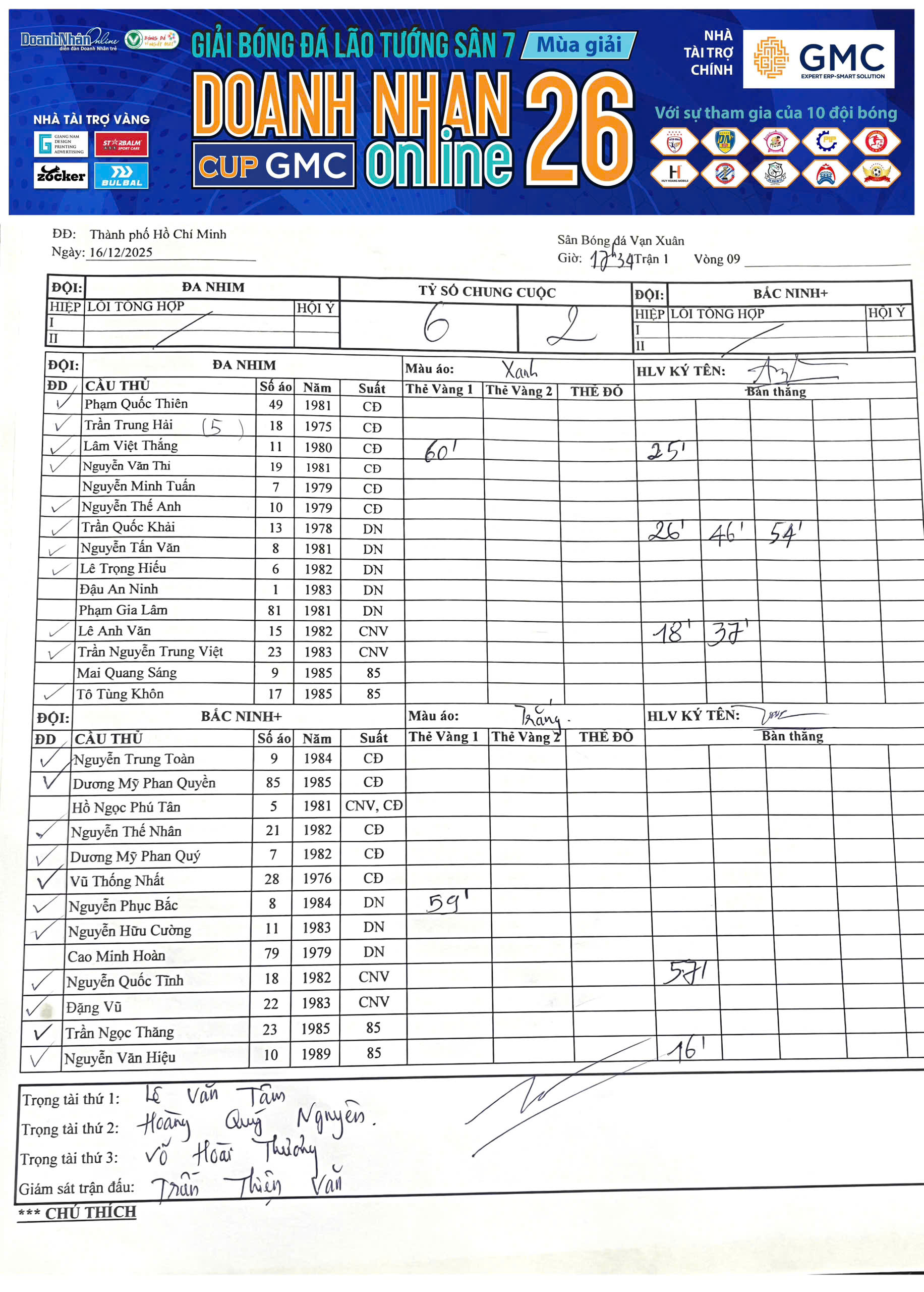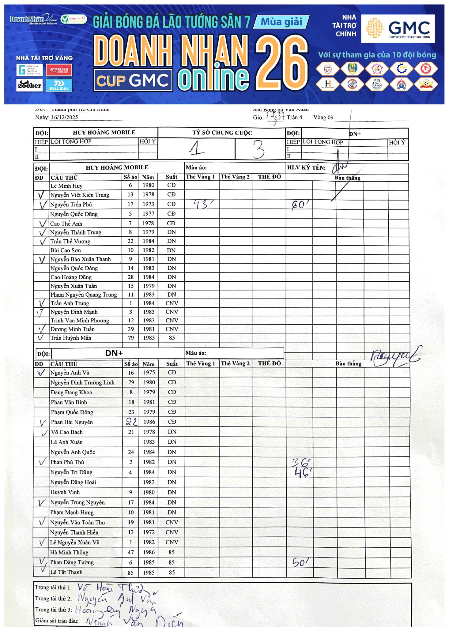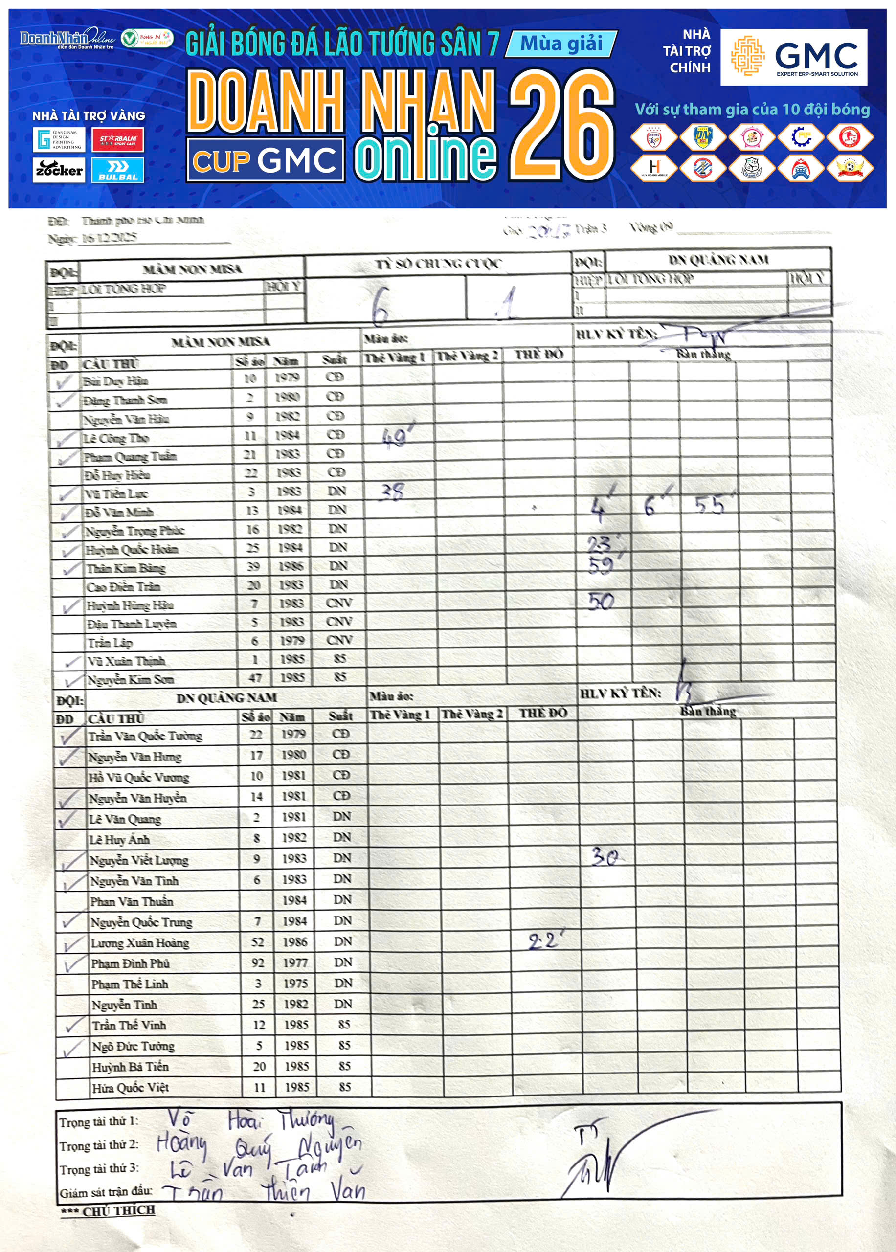 Kết quả Vòng 3 Giải Sân 7 Lão tướng DNOL Cup GMC Mùa 26 năm 2025-2026 (06/11/2025, 08:16 AM)