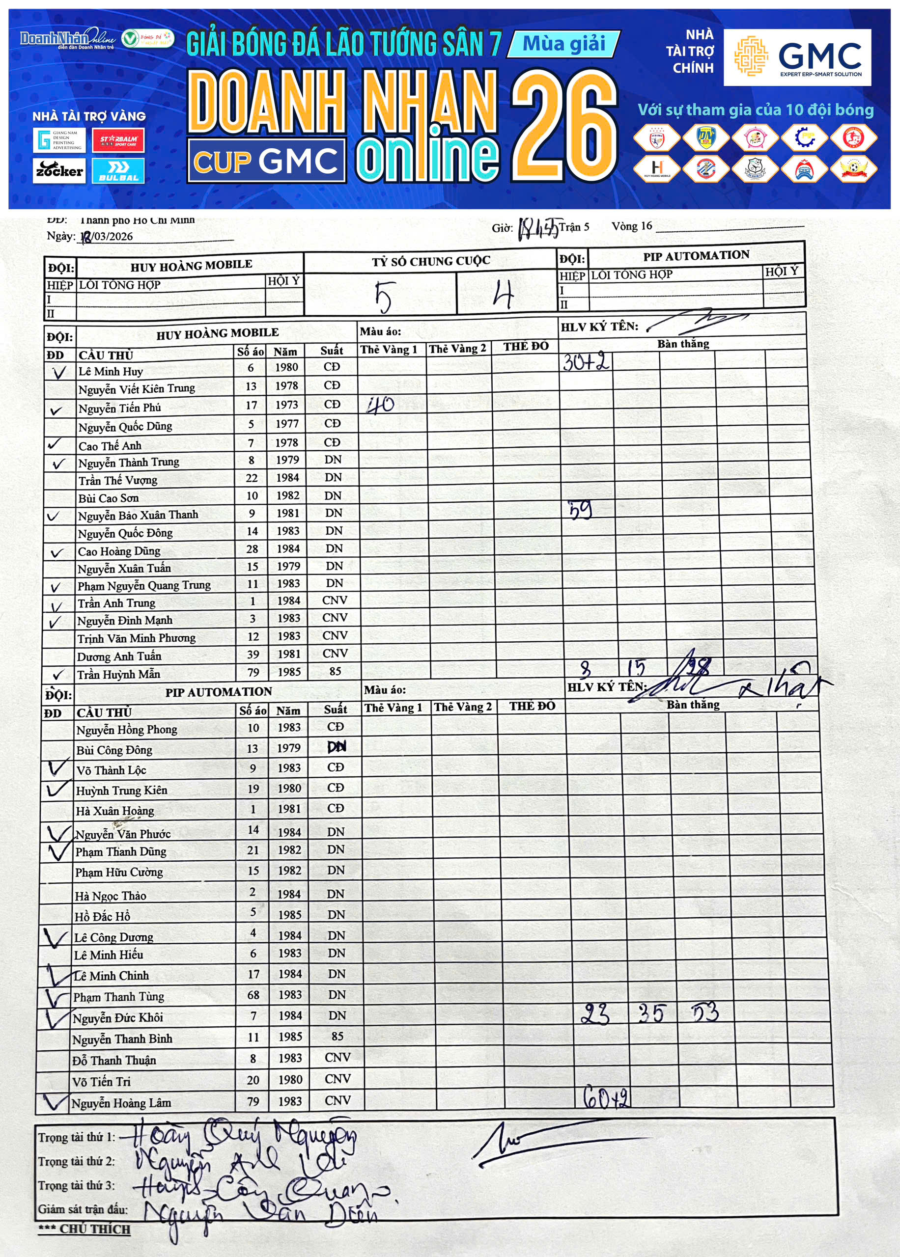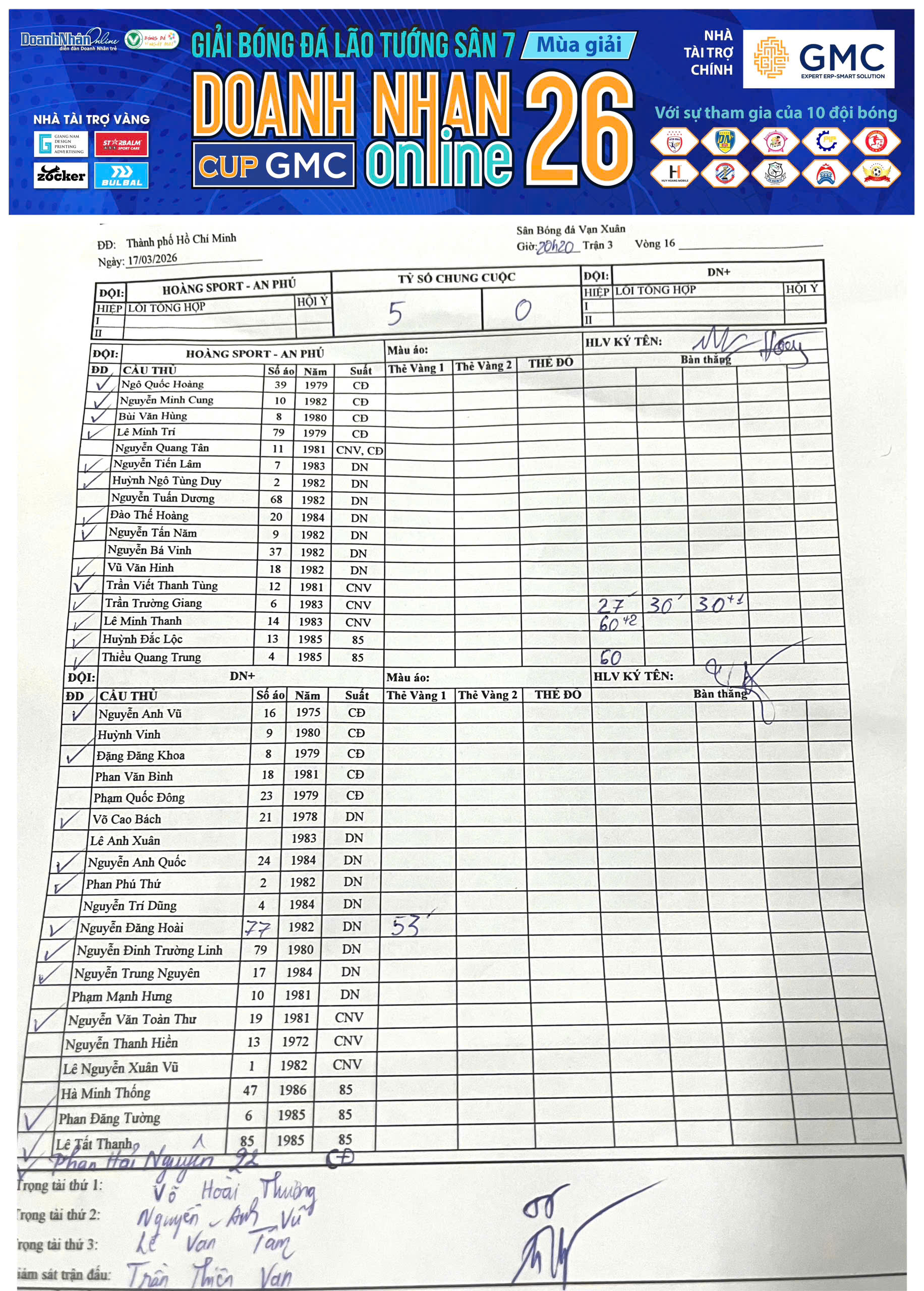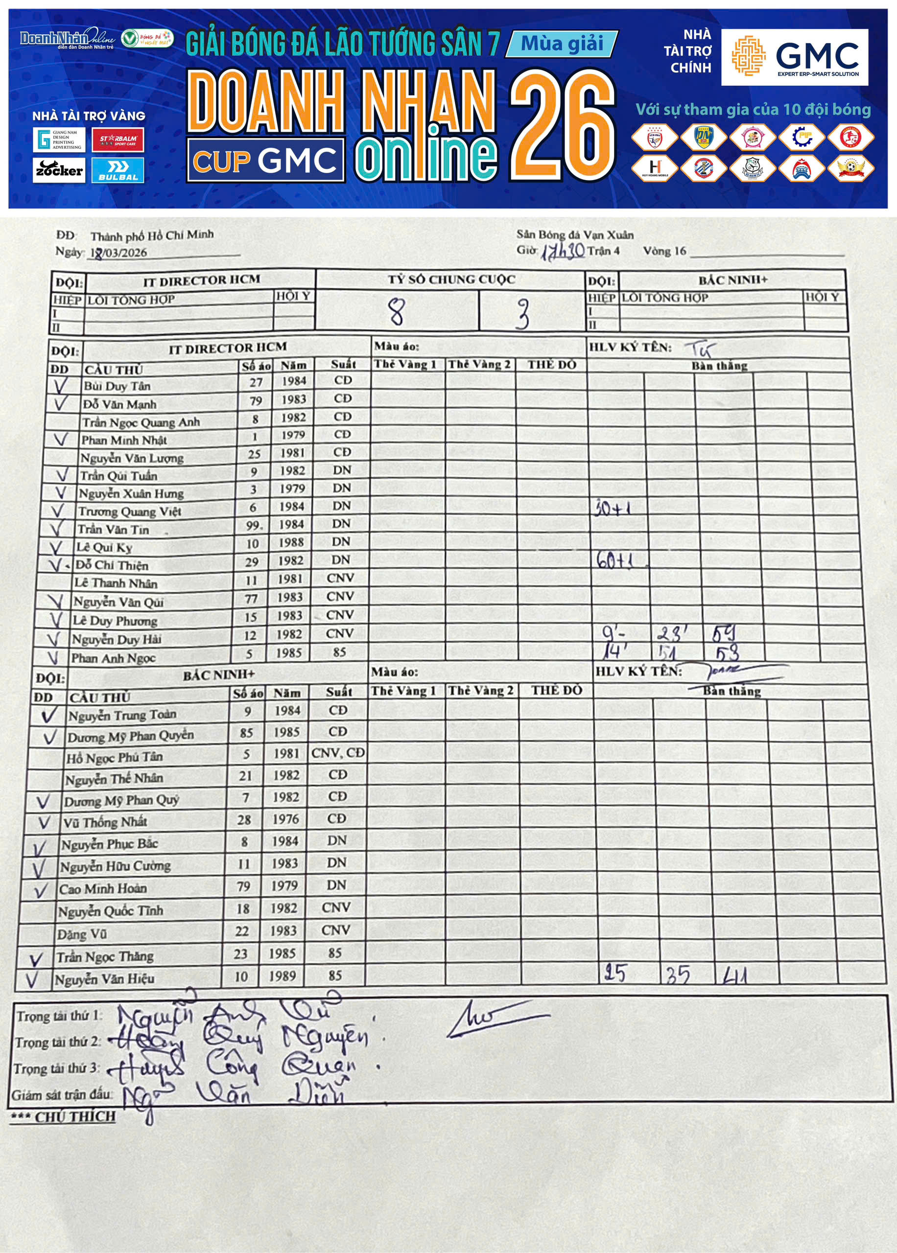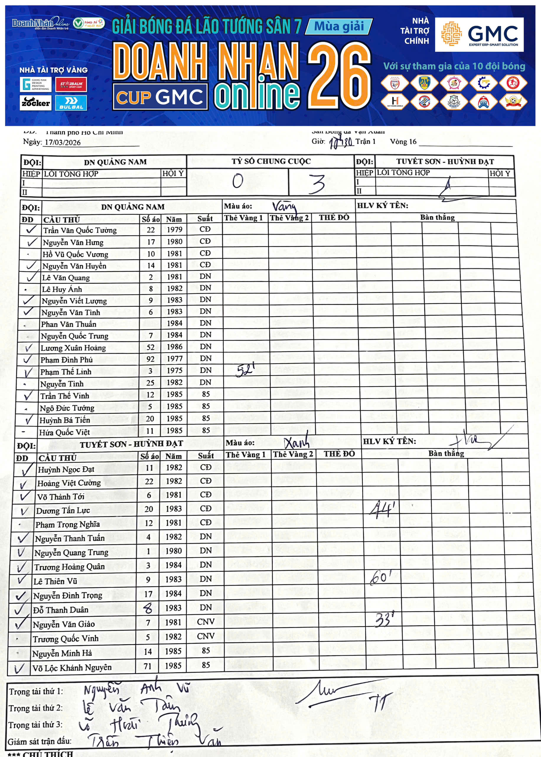 Kết quả Vòng 15 Giải Sân 7 Lão tướng DNOL Cup GMC Mùa 26 năm 2025-2026 (12/03/2026, 05:01 AM)