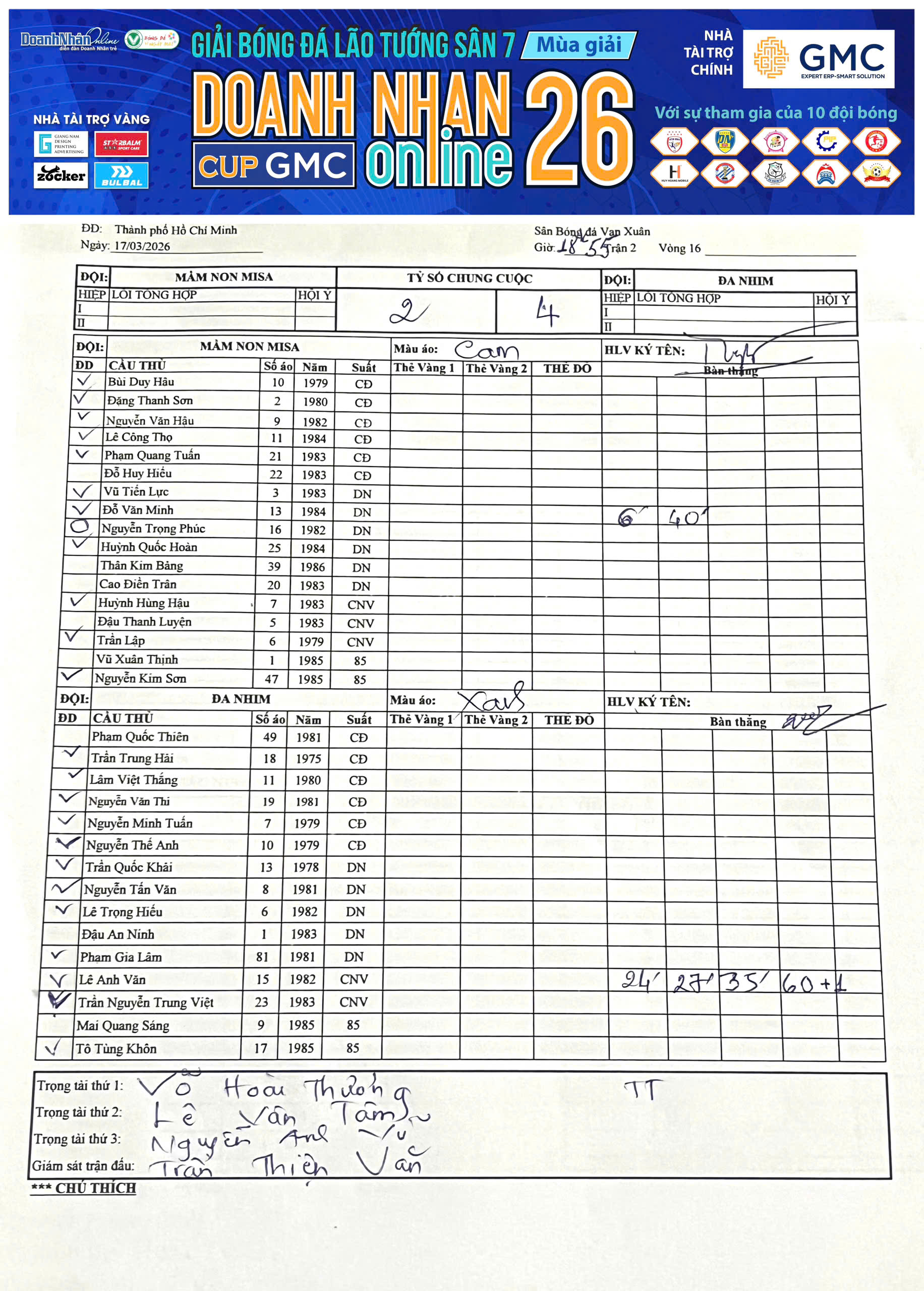 Kết quả Vòng 14 Giải Sân 7 Lão tướng DNOL Cup GMC Mùa 26 năm 2025-2026 (05/02/2026, 04:45 PM)