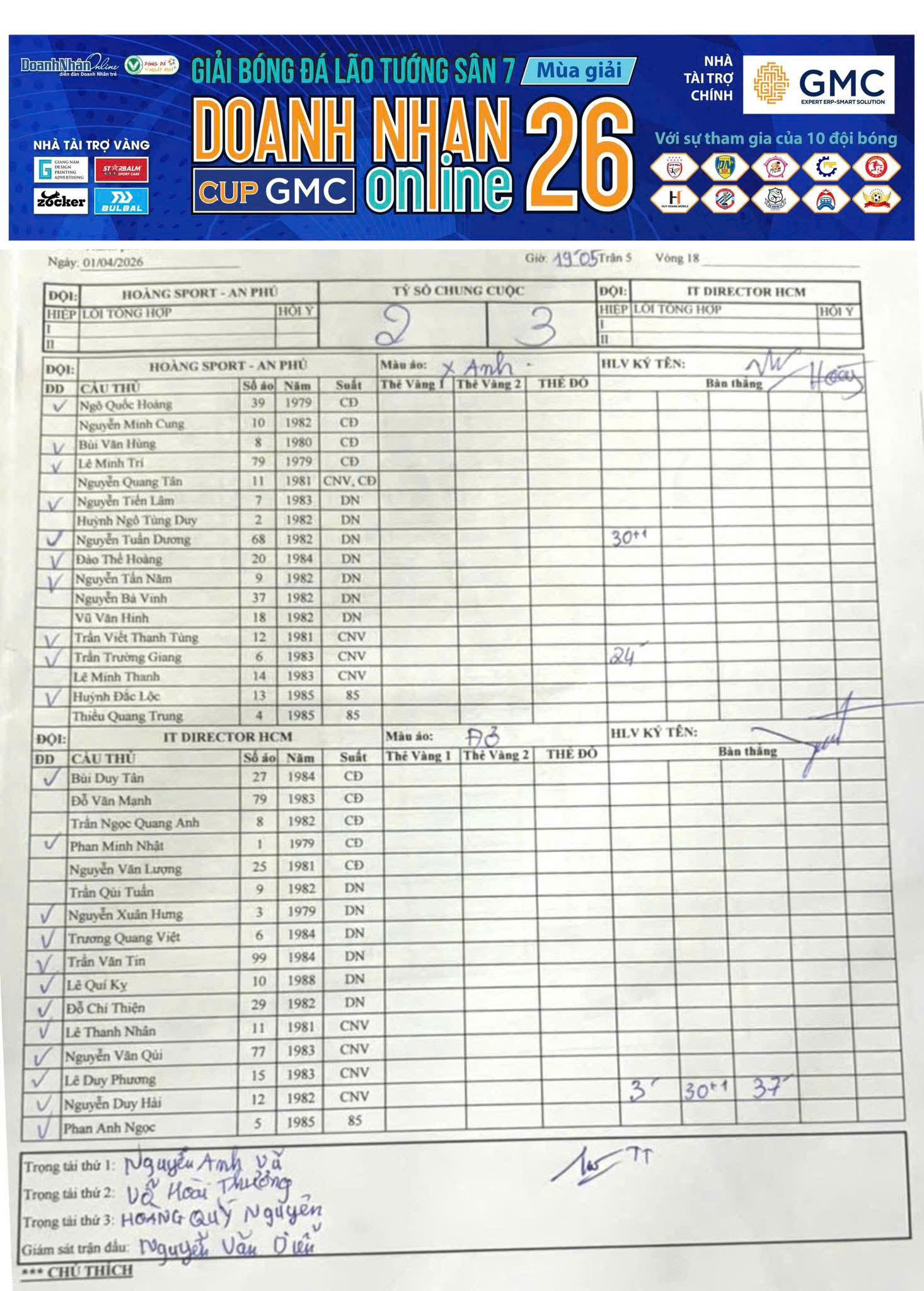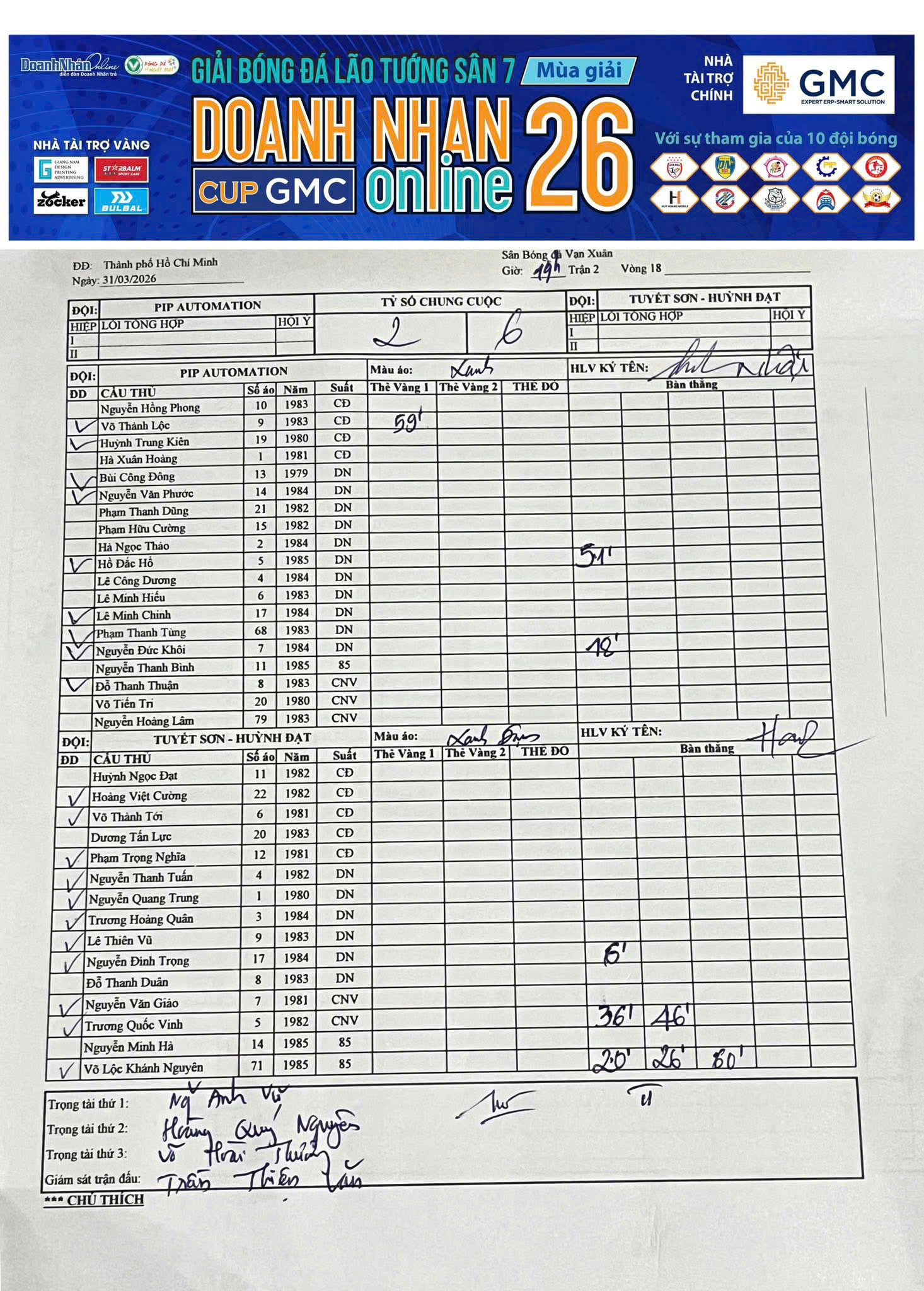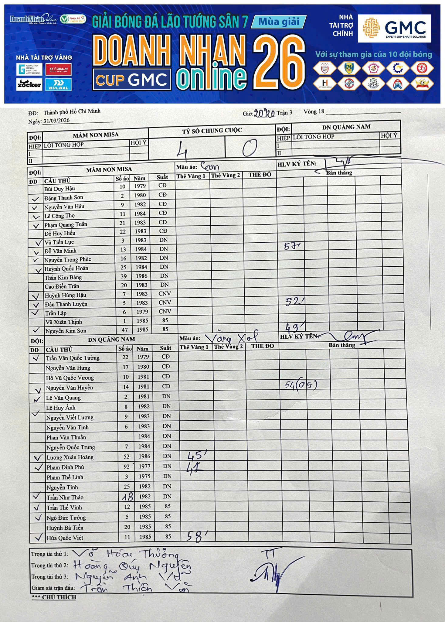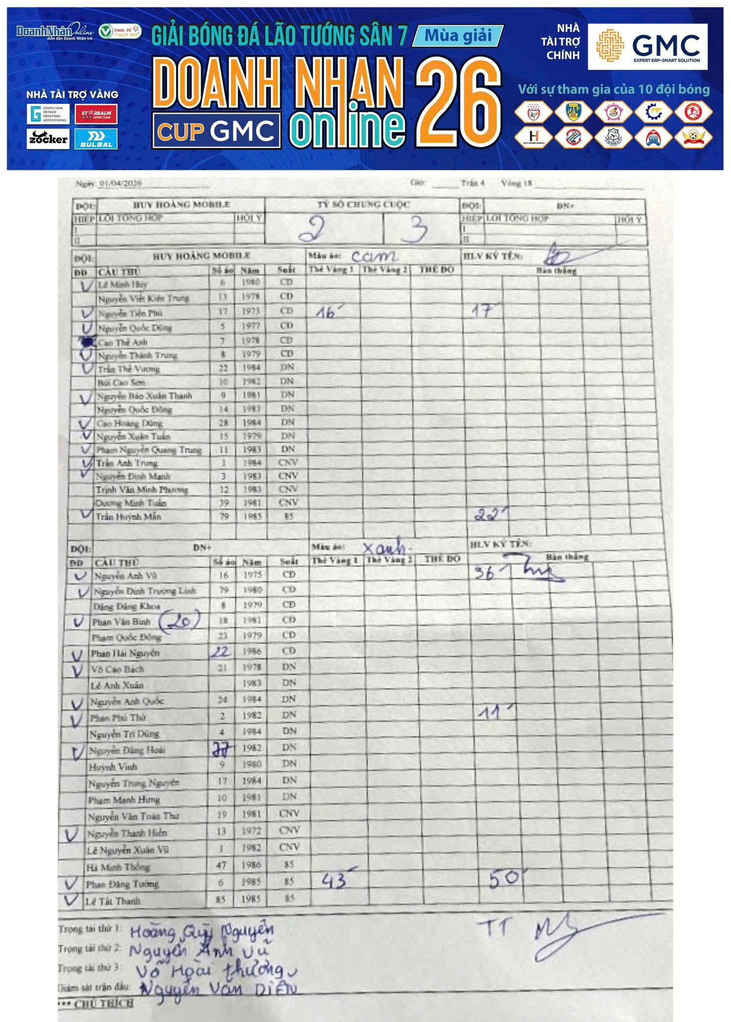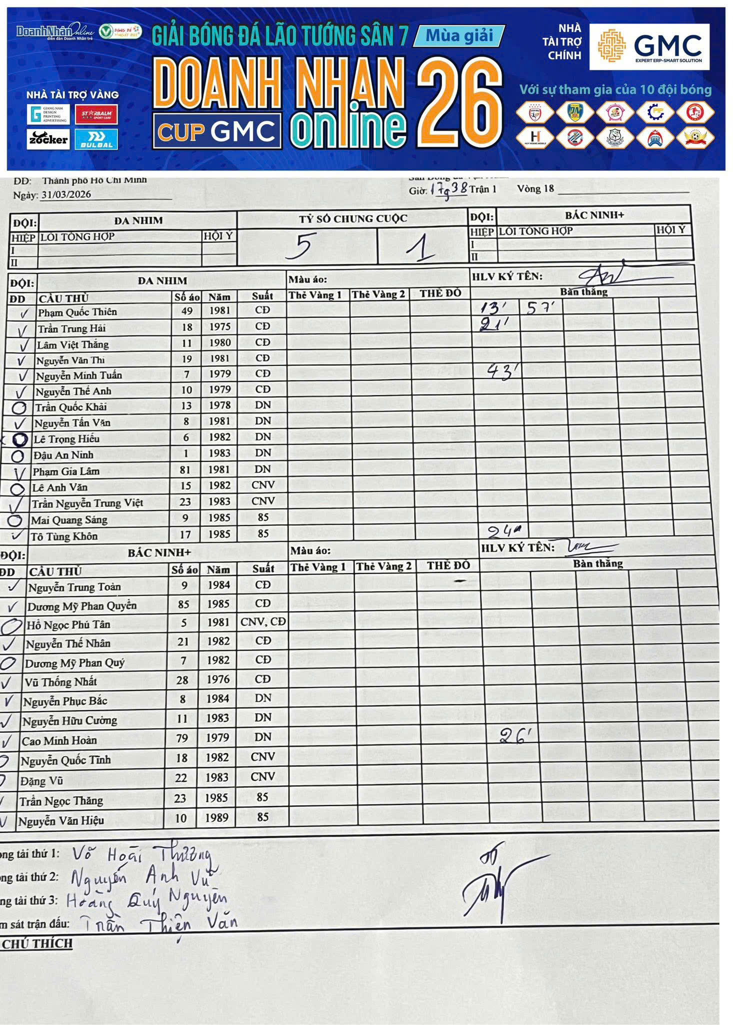 Kết quả Vòng 16 Giải Sân 7 Lão tướng DNOL Cup GMC Mùa 26 năm 2025-2026 (19/03/2026, 12:39 AM)