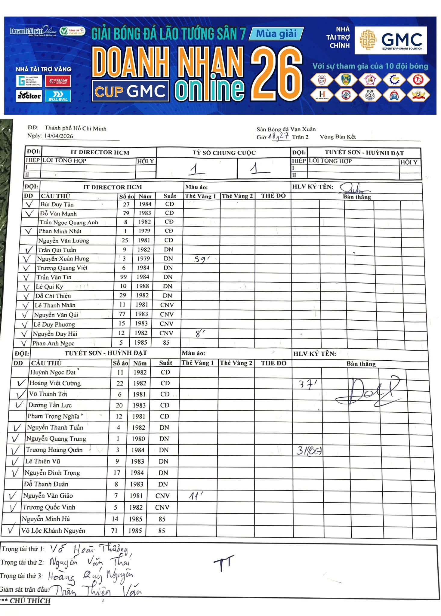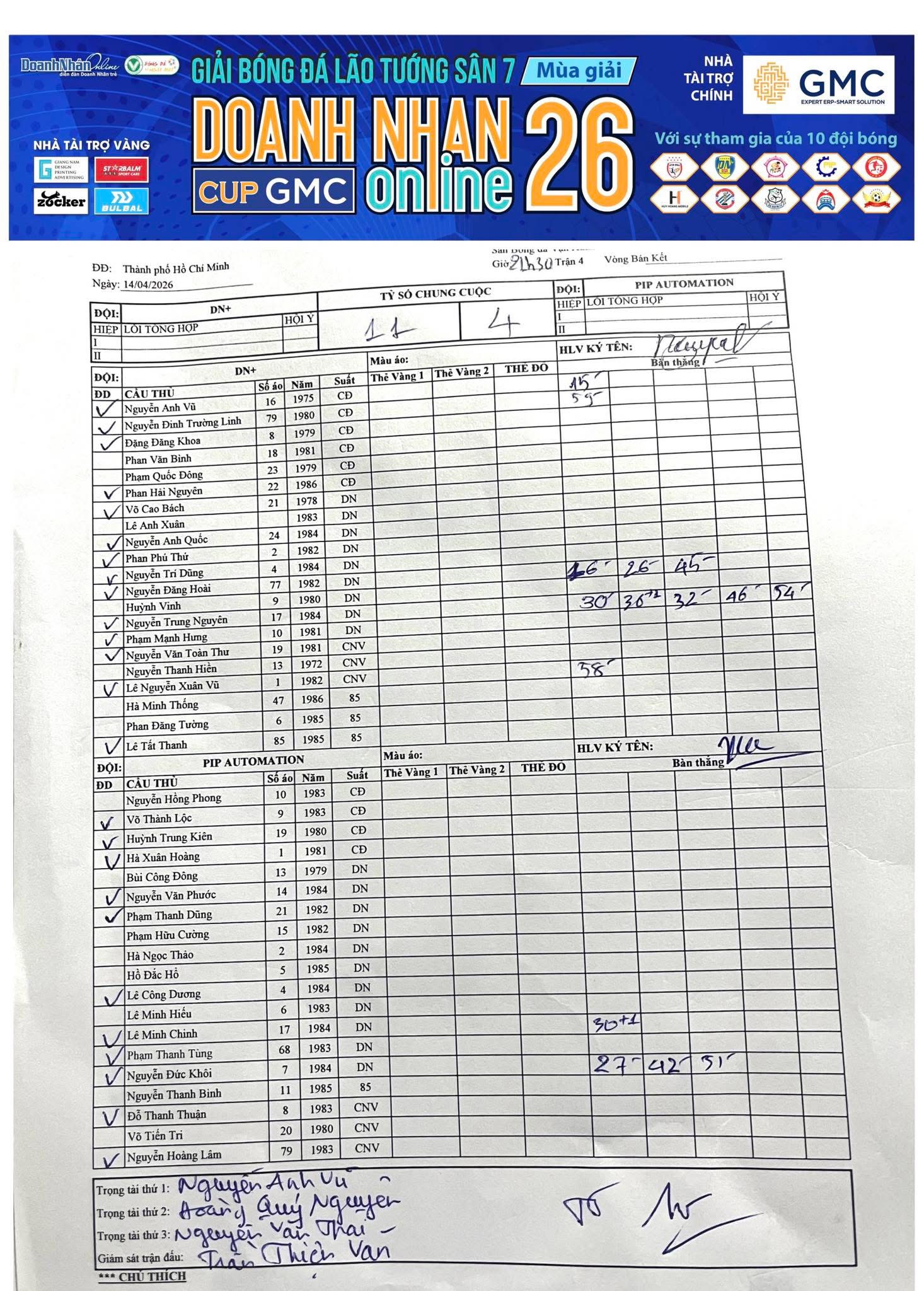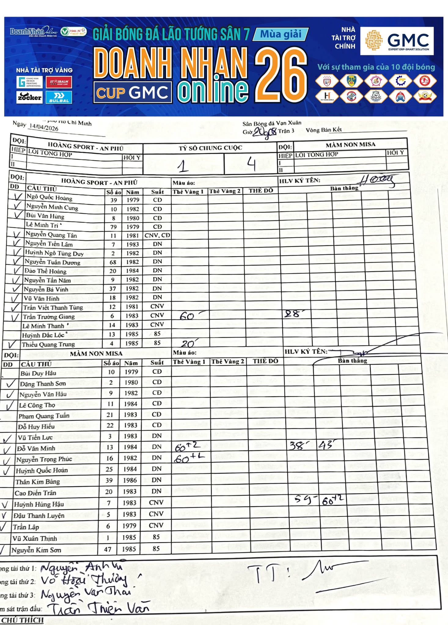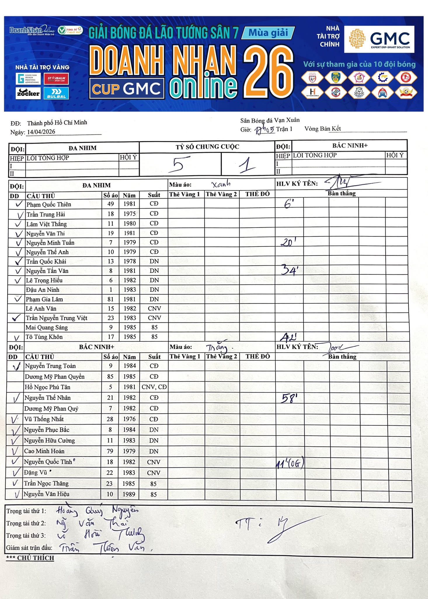 Kết quả Vòng 14 Giải Sân 7 Lão tướng DNOL Cup GMC Mùa 26 năm 2025-2026 (05/02/2026, 04:45 PM)